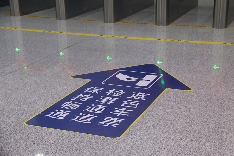 進站口引導設置在進站口的外立面,告知旅客進站口位置及相關輔助信息。進站口引導應設置進站口名稱標識,根據需要可設置輔助信息; 進站玻璃大門上張貼防撞條;進站口處如設置"車票復位口",進站口內側(候車室一側)設置出口標識。